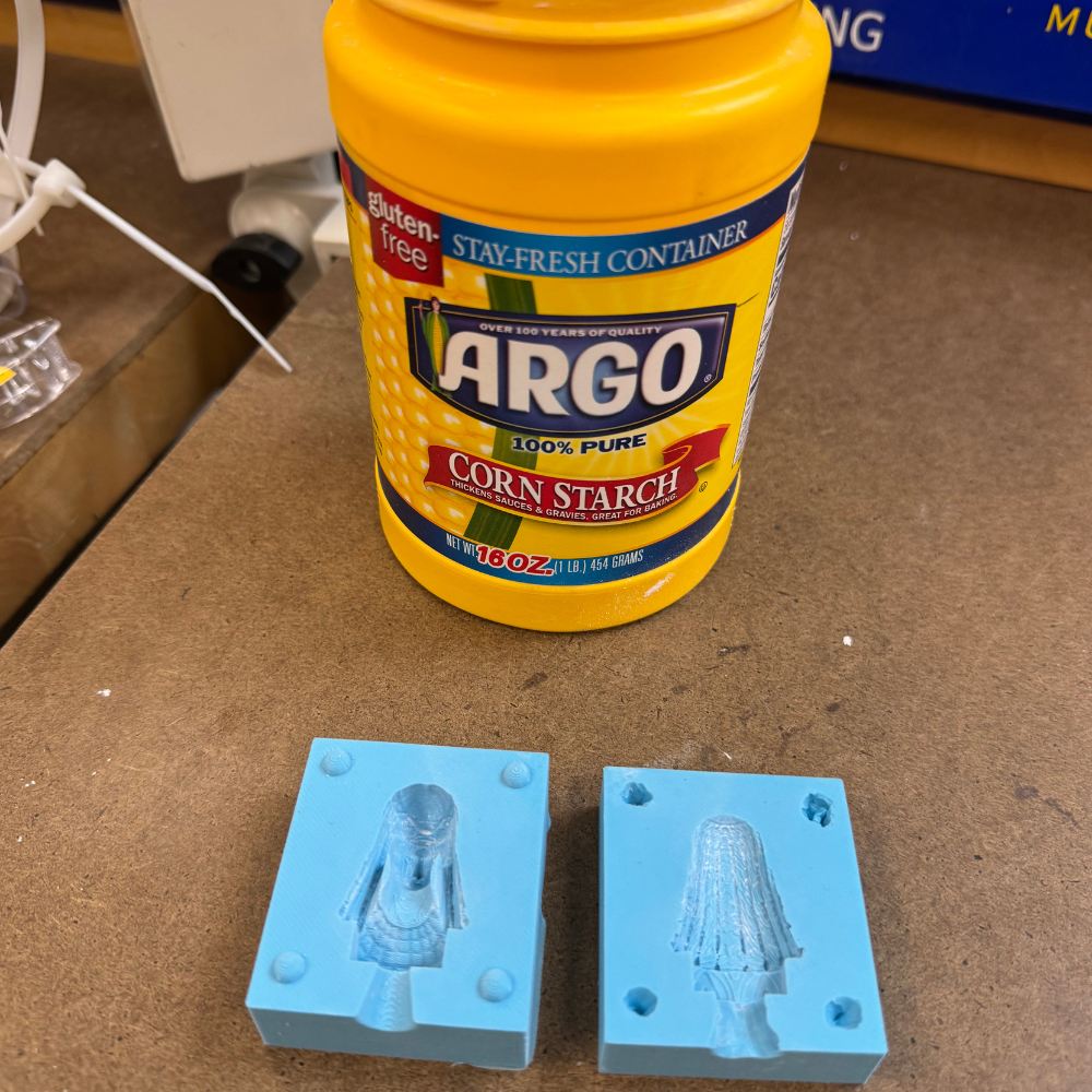 The mold surfaces were prepped using cornstarch to facilitate easy release during the casting process. The cornstarch acted as a fine release agent, preventing the molten metal from sticking to the silicone and ensuring a clean, detailed extraction of the figurine.